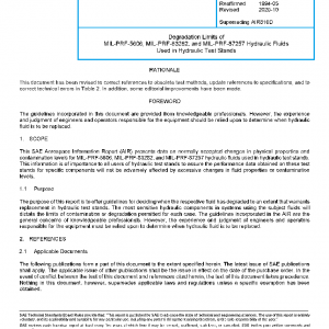 This SAE Aerospace Information Report (AIR) presents data on normally accepted changes in physical properties and contamination levels for MIL-PRF-5606, MIL-PRF-83282, and MIL-PRF-87257 hydraulic fluids used in hydraulic test stands. This information is of importance to all users of hydraulic test stands to assure the performance data obtained on these test stands for specific components will not be adversely affected by excessive changes in fluid properties or contamination levels.