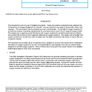 This SAE Aerospace Information Report (AIR) describes the general operating principles of demand oxygen equipment, including variant types such as diluter-demand and pressure breathing equipment. The sources of oxygen supply that can be used in connection with a demand oxygen mask are in principle the same as those used for other oxygen dispensing devices. Except for mention of a few features specifically related to demand equipment, this document does not discuss oxygen sources in detail and the reader is advised to consult other applicable documents that describe the operation of oxygen sources for additional information.
