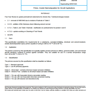 This specification establishes the requirements for a waterborne, corrosion-inhibiting, chemical- and solvent-resistant, anodic electrodeposition epoxy primer capable of curing at 200 to 210 °F (93 to 99 °C).