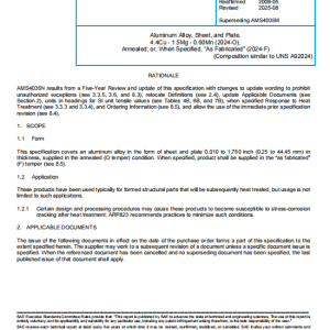 This specification covers an aluminum alloy in the form of sheet and plate 0.010 to 1.750 inch (0.25 to 44.45 mm) in thickness, supplied in the annealed (O temper) condition. When specified, product shall be supplied in the “as fabricated” (F) temper (see 8.5).