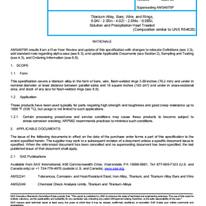 This specification covers a titanium alloy in the form of bars, wire, flash-welded rings 3.00 inches (76.2 mm) and under in nominal diameter or least distance between parallel sides and 16 square inches (103 cm2) and under in cross-sectional area, and stock of any size for flash-welded rings (see 8.6).