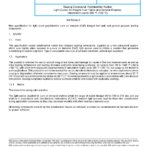 This specification covers polythioether rubber fuel resistant sealing compounds, supplied as a two-component system, which cure rapidly when exposed to a cure on demand (CoD) light source used to initiate a reaction that generates crosslinking of sealant polymers. Type 2 compounds also cure at ambient conditions, without light exposure.