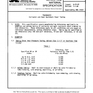 This specification covers manufacturing tolerances applicable to seamless and welded tubing of corrosion and heat resistant steel ordered to inch dimensions. These tolerances apply to all conditions and are based on individual measurements, unless otherwise noted. Tubing may be specified by two dimensions only (OD and wall thickness, ID and wall thickness, or OD and ID).