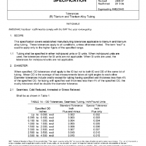 This specification covers established manufacturing tolerances applicable to titanium and titanium alloy tubing. These tolerances apply to all conditions, unless otherwise noted. The term “excl” is used to apply only to the higher figure of the specified range.