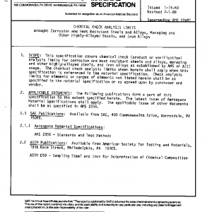 This specification covers chemical check (product or verification) analysis limits for corrosion and heat resistant steels and alloys, maraging and other highly-alloyed steels, and iron alloys as established by AMS or AISI usage. The chemical check analysis limits shown herein shall apply when this specification is referenced in the material specification. Check analysis limits for elements or ranges of elements not listed herein shall be as specified in the material specification or as agreed upon by purchaser and vendor.