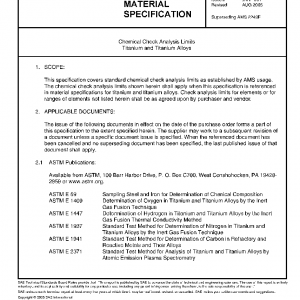 This specification covers standard chemical check analysis limits as established by AMS usage. The chemical check analysis limits shown herein shall apply when this specification is referenced in material specifications for titanium and titanium alloys. Check analysis limits for elements or for ranges of elements not listed herein shall be as agreed upon by purchaser and vendor.