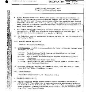 This specification covers chemical check analysis limits for wrought nickel alloys and cobalt alloys having nominal compositions made up of elements, other than iron, that comprise more than 50% of the total. The chemical check analysis limits shown herein shall apply when this specification is referenced in the material specification. Check analysis limits for elements or for ranges of elements not listed herein shall be as specified in the applicable material specification or as agreed upon by purchaser and vendor.