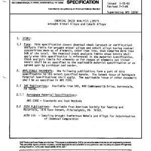 This specification covers chemical check (product or verification) analysis limits for wrought nickel alloys and cobalt alloys having nominal compositions made up of elements, other than iron, that comprise more than 50% of the total. The chemical check analysis limits shown herein shall apply when this specification is referenced in the material specification. Check analysis limits for elements or for ranges of elements not listed herein shall be as specified in the applicable material specification or as agreed upon by purchaser and vendor.