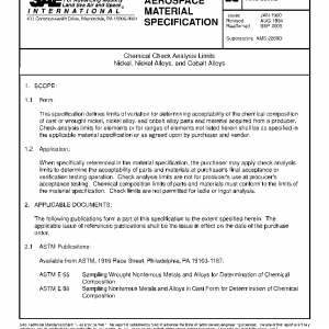 This specification defines limits of variation for determining acceptability of the chemical composition of cast or wrought nickel, nickel alloy, and cobalt alloy parts and material acquired from a producer. Check analysis limits for elements or for ranges of elements not listed herein shall be as specified in the applicable material specification or as agreed upon by purchaser and vendor.