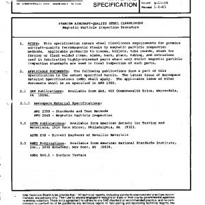 This specification covers steel cleanliness requirements for premium aircraft-quality ferromagnetic steels by magnetic particle inspection methods. Applicable primarily to blooms, billets, tube rounds, stock for forging or flash welded rings, slabs, bars, plate, tubing, and extrusions used in fabricating highly-stressed parts where very strict magnetic particle inspection standards are used in final inspection of such parts.