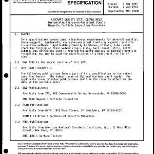 This specification covers steel cleanliness requirements for aircraft-quality ferro-magnetic, hardenable, corrosion-resistant steels by magnetic particle inspection methods. Applicable primarily to blooms, billets, tube rounds, stock for forging or flash welded rings, slabs, bars, sheet, strip, plate, tubing, and extrusions used in fabricating parts subject to magnetic particle inspection, but may be used for qualification of a heat, melt, or lot of steel.