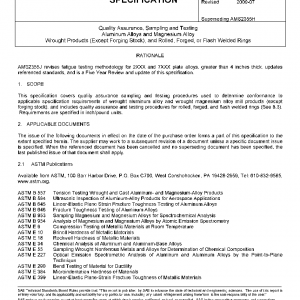 This specification covers quality assurance sampling and testing procedures used to determine conformance to applicable specification requirements of wrought aluminum alloy and wrought magnesium alloy mill products (except forging stock), and includes quality assurance and testing procedures for rolled, forged, and flash welded rings (See 8.3). Requirements are specified in inch/pound units.