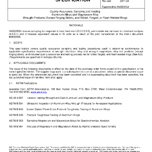 This specification covers quality assurance sampling and testing procedures used to determine conformance to applicable specification requirements of wrought aluminum alloy and wrought magnesium alloy mill products (except forging stock), and includes quality assurance and testing procedures for rolled, forged, and flash welded rings (See 8.3). Requirements are specified in inch/pound units.