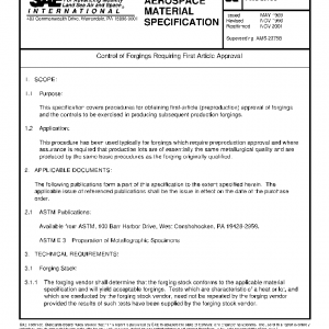 This specification covers procedures for obtaining first-article (preproduction) approval of forgings and the controls to be exercised in producing subsequent production forgings.