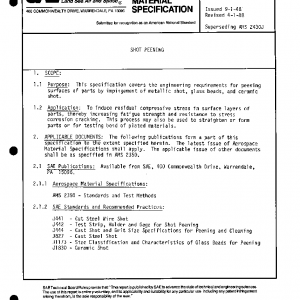 This specification covers the engineering requirements for peening surfaces of parts by impingement of metallic shot, glass beads, and ceramic shot.