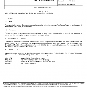 This specification covers the engineering requirements for automatic peening of surfaces of parts by impingement of metallic shot, glass beads, or ceramic shot.