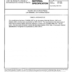 This specification covers the engineering requirements for selective (brush) electrodeposition of nickel and the properties of the deposit. This process has been used typically to provide moderate corrosion and oxidation resistance and dimensional build-up and restoration of parts which may operate in service up to 700 degrees F (371 degrees C), where low tensile stress in the deposit is required to avoid marked reduction of fatigue strength, but usage is not limited to such applications.