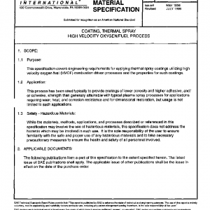 This specification covers engineering requirements for applying thermal spray coatings utilizing high velocity oxygen fuel (HVOF) combustion driven processes and the properties for such coatings.
