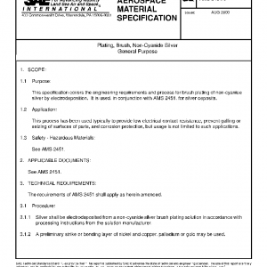 This specification covers the engineering requirements and process for brush plating of non-cyanide silver by electrodeposition. It is used, in conjunction with AMS 2451, for silver deposits.