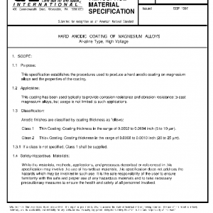 This specification establishes the procedures used to produce a hard anodic coating on magnesium alloys and the properties of the coating.