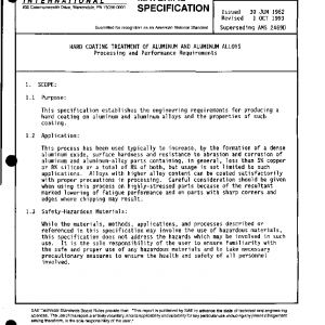 This specification establishes the engineering requirements for producing a hard coating on aluminum and aluminum alloys and the properties of such coating.