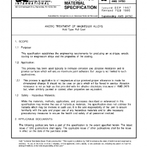 This specification establishes the engineering requirements for producing an acid-type, anodic coating on magnesium alloys and the properties of the coating.