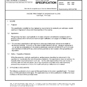 This specification establishes the engineering requirements for producing an acid-type, anodic coating on magnesium alloys and the properties of the coating.
