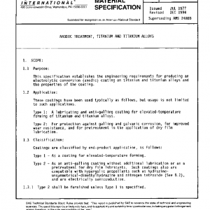 This specification establishes the engineering requirements for producing an electrolytic conversion (anodic) coating on titanium and titanium alloys and the properties of the coating.