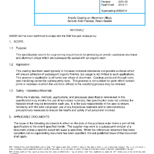 This specification covers the engineering requirements for producing an anodic coating on aluminum and aluminum alloys which are subsequently sealed with an organic resin.