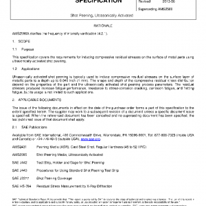 This specification covers the requirements for inducing compressive residual stresses on the surface of metal parts using ultrasonically activated shot peening.