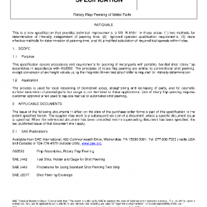 This specification covers procedures and requirements for peening of metal parts with portable, bonded-shot, rotary flap assemblies in accordance with AS2592. The principles of rotary flap peening are similar to conventional shot peening, except conversion of arc height values using the magnetic Almen test strip holder is required for intensity determination.