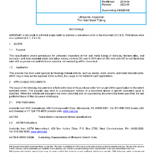 This specification covers procedures for ultrasonic inspection of thin wall metal tubing of titanium, titanium alloy, and corrosion- and heat-resistant steels and alloys having nominal OD over 0.1875 inch (4.762 mm) with OD to wall thickness ratio of 8 or greater and wall thickness variation not exceeding ±10% of nominal.
