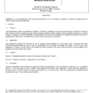 This specification covers procedures for ultrasonic immersion inspection of premium grade wrought titanium and titanium alloy forgings. Premium grade is a term used to describe titanium alloys used for critical rotating components in turbine engines. For details, see SAE AMS2380, the specification that covers the procedures for approval of products of premium-quality titanium alloys and the controls to be exercised in producing such products.