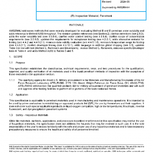 This specification establishes the classification, technical requirements, tests, and test procedures for the qualification, approval, and quality verification of all materials used in the liquid penetrant methods of inspection with the exception of those excluded in the application section.