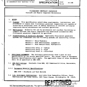 This specification establishes requirements, instructions, and procedures to ensure that fluorescent penetrant inspections are capable of achieving an acceptable level of defect detection on aircraft and engine components during maintenance and overhaul operations.