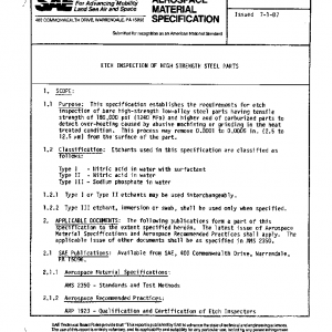 This specification establishes the requirements for etch inspection of bare high-strength low-alloy steel parts having tensile strength of 180,000 psi (1240 MPa) and higher and of carburized parts to detect over-heating caused by abusive machining or grinding in the heat treated condition. This process may remove 0.0001 to 0.0005 in. (2.5 to 12.5 μm) from the surface of the part.