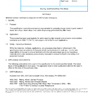 This specification covers the engineering requirements for producing brazed joints in parts made of steels, iron alloys, nickel alloys, and cobalt alloys using gold-nickel alloy filler metal.