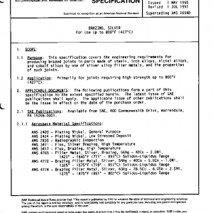 This specification covers the engineering requirements for producing brazed Joints in parts made of steels, iron alloys, nickel alloys, and cobalt alloys by use of silver alloy filler metals, and the properties of such Joints.