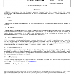 This specification defines the requirements for in-process correction of foundry discontinuities by manual welding of castings.