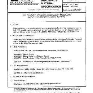 This specification, in conjunction with the general requirements for steel heat treatment covered in AMS2759, establishes the requirements for heat treatment of carbon and low-alloy steel parts to minimum ultimate tensile strengths below 220 ksi (1517 MPa). Parts are defined in AMS2759.