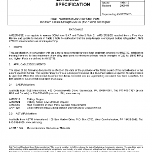 This specification, in conjunction with the general requirements for steel heat treatment covered in AMS2759, establishes the requirements for heat treatment of low-alloy steel parts to minimum ultimate tensile strengths of 220 ksi (1517 MPa) and higher. Parts are defined in AMS2759.
