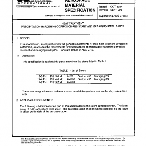 This specification, in conjunction with the general requirements for steel heat treatment covered in AMS2759, establishes the requirements for heat treatment of precipitation-hardening corrosion- resistant and maraging steel parts. Parts are defined in AMS2759.