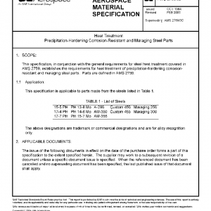 This specification, in conjunction with the general requirements for steel heat treatment covered in AMS 2759, establishes the requirements for heat treatment of precipitation-hardening corrosion-resistant and maraging steel parts. Parts are defined in AMS 2759.