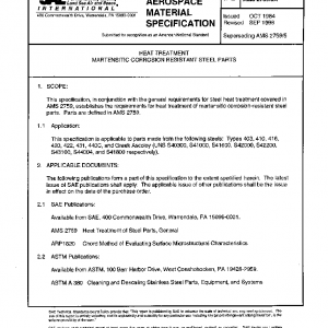 This specification, in conjunction with the general requirements for steel heat treatment covered in AMS 2759, establishes the requirements for heat treatment of martensitic corrosion-resistant steel parts. Parts are defined in AMS 2759.This specification is applicable to parts made from the following steels: Types 403, 410, 416, 420, 422, 431, 440C, and Greek Ascoloy (UNS S40300, S41000, S41600, S42000, S42200, S43100, S44004, and S41800 respectively).