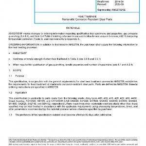 This specification, in conjunction with the general requirements for steel heat treatment covered in AMS2759, establishes the requirements for heat treatment of martensitic corrosion-resistant steel parts. Parts are defined in AMS2759. General ordering instructions are specified in AMS2759.