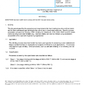 This document specifies the procedure and requirements for heat treating low-alloy and tool steels and for their subsequent gas nitriding by the use of raw or dissociated ammonia. Specific process parameters are given for Nitralloy 135M, Nitralloy EZ, Nitralloy N, 4140, 4340, D6AC and H11 steels. Additional alloys and steel families (e.g., stainless steels) can also be nitrided using parameters acceptable to the cognizant engineering organization.