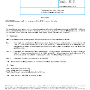 This specification, in conjunction with the general requirements for steel heat treatment covered in AMS2759, establishes the requirements and procedures for three classes of gas, vacuum, liquid, and low pressure (LPC) carburizing and related heat treatment of parts fabricated from carburizing grade steels. It does not cover pack carburizing.