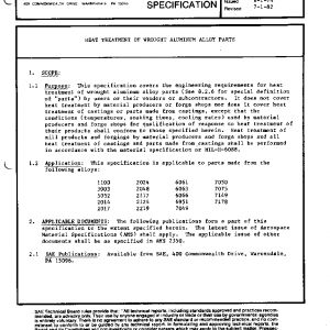 This specification covers the engineering requirements for heat treatment of wrought aluminum alloy parts (See 8.2.6 for special definition of “parts”) by users or their vendors or subcontractors. It does not cover heat treatment by material producers or forge shops nor does it cover heat treatment of castings or parts made from castings, except that the conditions (temperatures, soaking times, cooling rates) used by material producers and forge shops for qualification of response to heat treatment of their products shall conform to those specified herein. Heat treatment of mill products and forgings by material producers and forge shops and all heat treatment of castings and parts made from castings shall be performed in accordance with the material specification or MIL-H-6088.