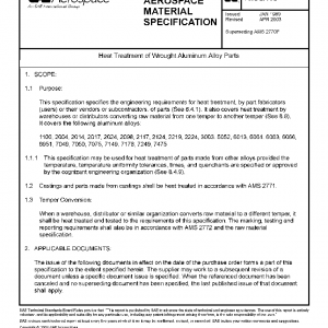 This specification specifies the engineering requirements for heat treatment, by part fabricators (users) or their vendors or subcontractors, of parts (See 8.4.1). It also covers heat treatment by warehouses or distributors converting raw material from one temper to another temper (See 8.8). It covers the following aluminum alloys: