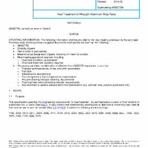 This specification specifies the engineering requirements for heat treatment, by part fabricators (users) or their vendors or subcontractors, of parts (See 8.8.1). It also covers heat treatment by warehouses or distributors converting raw material from one temper to another temper (See 1.3 and 8.5). It covers the following aluminum alloys: